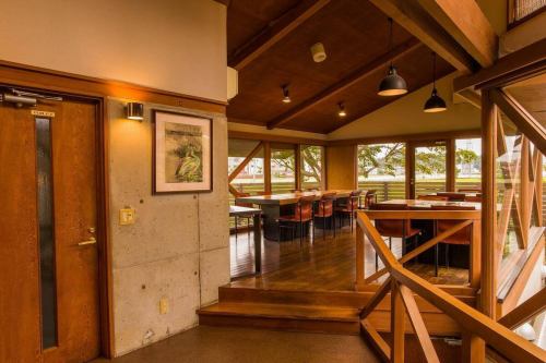 The interior of the restaurant has a warm atmosphere with a wooden motif. The large windows create an open feeling, and the natural scenery outside subtly creates a nice atmosphere.